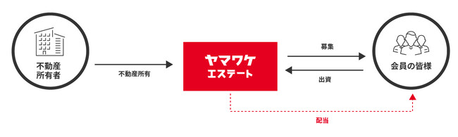 不動産特定共同事業法(第1号・第2号)に則り、「ヤマワケエステート」がビルなどの不動産物件を購入後、運用して(賃借や売却等)得られた利益の一部を、投資家に配当として還元いたします。そのため、通常は高額な出資が必要となる不動産投資とは違い、投資家は1万円(*1)から投資をすることができます。
