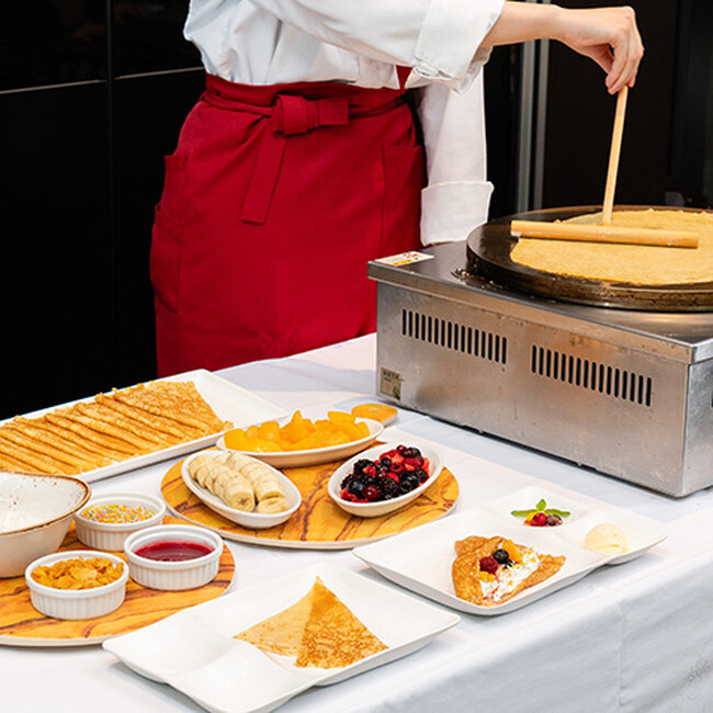 内容:パフォーマンス料理は「牛ロースのステーキ」、パフォーマンススイーツは「クレープ」をご用意。目の前で焼き上げたクレープ生地に、フルーツやアイスクリーム・ホイップなどお好きなものを組み合わせてオリジナルクレープ作りをお楽しみいただけます。