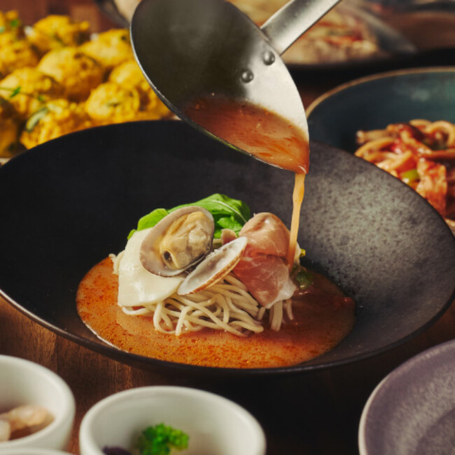 しっかりとした歯ごたえとコシのある、長崎県五島製麺の半生ラーメンを使用します。トマトやオリーブオイル・ガーリックを、アサリの風味をほのかに感じるトマトスープと合わせ、絶品のラーメンに仕上げます。