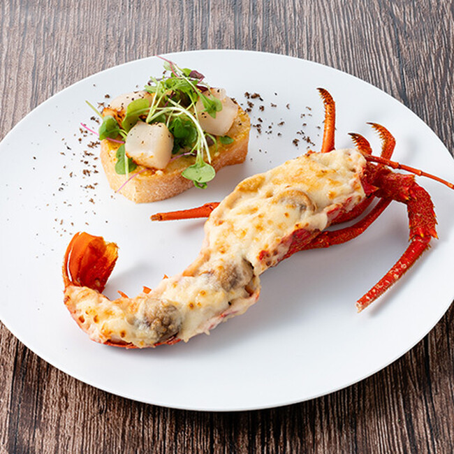 海老の中でもうまみ成分や甘味成分が豊富に含まれる伊勢海老を、同じくうま味成分が豊富に含まれるマッシュルームを加え、グラタンに仕上げました。濃厚な海老ミソをたっぷり塗りこんだホタテ貝柱のブルスケッタと共にお召し上がりください。