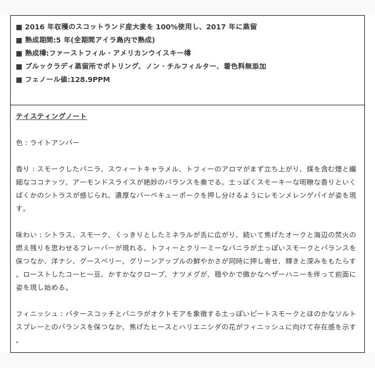 アイラ島で収穫されたスコットランド産大麦を100%使用し、214.2 ppmのスーパーヘビーなピーティングによる熟成。バーボン樽とセカンドフィル・ワイン樽で熟成され、甘く熱を帯びた紛れもないマッシュの香りと、スウィートヴァニラ、トフィー、土っぽいスモークの味わいをお楽しみいただけます。