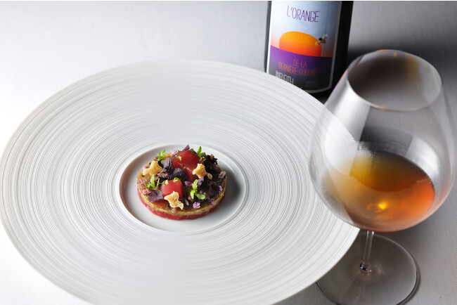 貝の出汁をふんだんに使用し、凝縮した磯の旨味が特徴の「貝焼き味噌」には、磯の香りを優しく包み込む微発酵の赤ワインを合わせます。「ランブルスコ」は程良い甘みと渋み、酸味のバランスが取れたフルーティさが特徴で、一皿目にふさわしい軽やかな味わいを堪能できます。