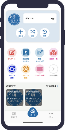 当社は、利用者向けの「堺エコライフポイント」アプリのシステム開発を担います。当アプリは当社が展開するリージョナルスーパーアプリ(R)(RSA)として開発しており、店舗や行政からのお知らせ配信、アンケート機能など、さまざまな機能も搭載しています。