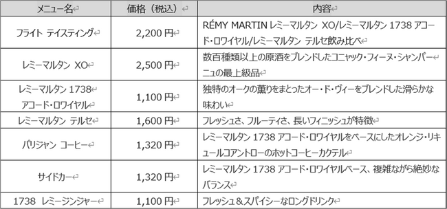 今回、提供するレミーマルタンの限定メニューは、REMY MARTINレミーマルタン XO、レミーマルタン1738アコード・ロワイヤルおよびレミーマルタン テルセの3種類の飲み比べをはじめ、秋の夜長にぴったりのシルキーなテクスチャーが心地よいレミーマルタン1738アコード・ロワイヤルをベースにしたリッチなコーヒーのホットカクテル「パリジャンコーヒー」など計7種類。さらにレミーマルタンを多角的に楽しんでいただくため、2杯目以降カクテルをご注文いただいた方にはレミーマルタンVSOP 50mlボトルを1本プレゼントいたします。こだわり抜かれた唯一無二のバランスが描きだす、コニャック・フィーヌ・シャンパーニュ レミーマルタンの魅力が大人の五感を呼び覚ます感覚を、ぜひお楽しみください。
