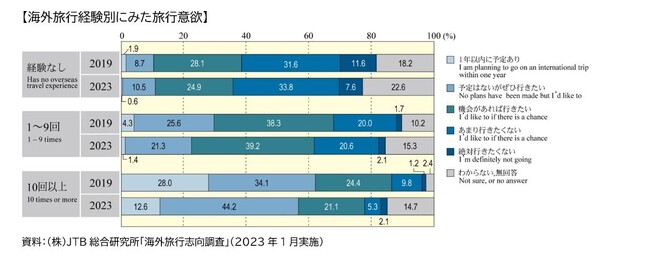 かつて、アメリカ同時多発テロ(9.11)や、SARSなどのクライシスの影響を受けた海外旅行マーケットにおいては、海外旅行慣れした経験値の高い旅行者から渡航を再開する傾向がみられていました。この傾向はコロナ禍以降にも当てはまるようです。独自アンケートの結果から、2021年および2022年の前半と後半における旅行者の海外旅行経験を比較すると、水際対策が緩和され、需要回復の兆しがみられた2022年以降は、徐々に経験値の高い旅行者の割合が上昇していることが分かります。2019年時点の海外旅行経験別にみた旅行意欲と比較すると、具体的な旅行計画までは立てていないものの、「予定はないがぜひ行きたい」人の割合が増加している傾向がみられており、今後のさらなる需要回復が期待されます。