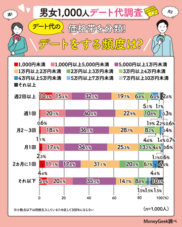 頻繁にデートするカップルほど1回当たりの出費が少なくなる傾向があり、週1回のペースでデートしているカップルの6割以上が1万円以下でした。