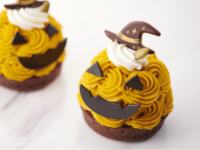 コクのある北海道産えびすかぼちゃを使用したなめらかなパンプキンクリームに、ほろ苦いキャラメル風味のクリームブリュレをとじこめ、ジャック・オ・ランタンをイメージして顔や帽子を飾りました。
