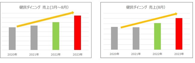 ●「健民ダイニング」は、2020年にスタートしたテイクアウトの需要が新型コロナの5類移行後も落ち込むことがなかったこと、客単価アップと来店客数の回復から、売上が好調です。
