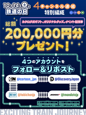 ケーブルテレビ、スカパー!、ひかりTVなどIPTVで放送中の「カートゥーン ネットワーク」「ディスカバリーチャンネル」「旅チャンネル」「MONDO TV」を運営するディスカバリー・ジャパン株式会社(本社:東京都港区/代表取締役社長:杉本将)は、10月14日の鉄道の日を記念して『鉄道の日記念!4チャンネル連結特別編成』を企画し放送いたします。https://www.discoveryjapan.jp/news/trainjorney_cp/