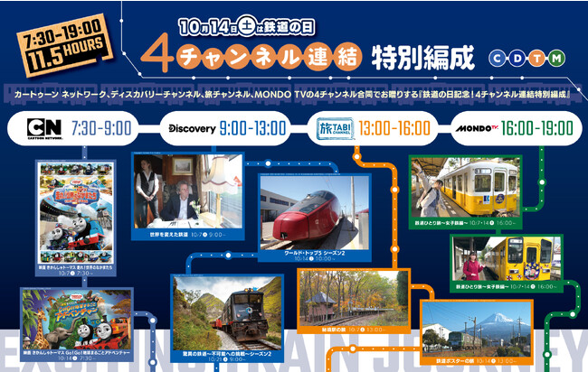 「カートゥーン ネットワーク」「ディスカバリーチャンネル」「旅チャンネル」「MONDO TV」の4チャンネル合同でお贈りする『鉄道の日記念!4チャンネル連結特別編成』は、10月7、14日(土)の2週に渡り、各チャンネルの鉄道番組をリレー形式で連続放送いたします。