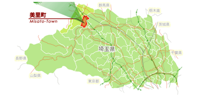 美里町は、東京都心より80km、埼玉県の北西部に位置し、東部は深谷市、北部・西部は本庄市、南部は寄居町および長瀞町にそれぞれ隣接しています。