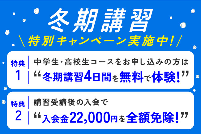冬期講習では、勉強の"つまずき"を解消。苦手をなくし基礎学力を身につけることで、3学期のテストで点数アップすることができます。この冬、中学生・高校生限定で講習授業4日間を無料で体験することができます。
