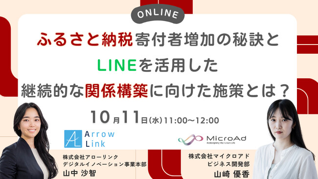 地域コミュニティ強化のパイオニア、株式会社アローリンク(本社:兵庫県神戸市、代表取締役:蓬莱和真)とデジタルマーケティングのリーダー、株式会社マイクロアド(本社:東京都、代表取締役 社長執行役員:渡辺健太郎、証券コード9553)が、2023年10月11日に開催する特別セミナーで、これまでにない地域との絆の創造方法を詳細に解説します。ふるさと納税寄付者を増やすための施策と、LINEを活用した関係構築の実用的な手法を学び、地域との新しい関わり方を発見しませんか?