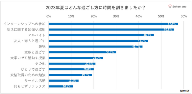 夏休みの過ごし方の1位は「インターンシップへの参加」57%、2位は「就活に関する勉強や取り組み」55%に。「友人・恋人と過ごす」は44%にとどまる