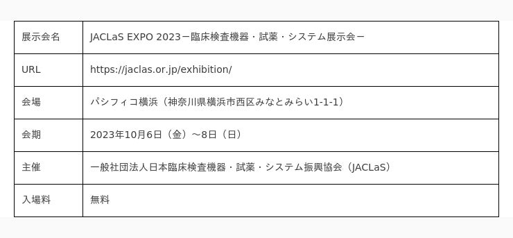 本展示会は、一般社団法人日本臨床検査機器・試薬・システム振興協会(JACLaS)が開催する日本最大級の臨床検査分野の展示会です。150社以上が出展し、臨床検査機器・試薬・システムに関連する製品が一堂に集まります。