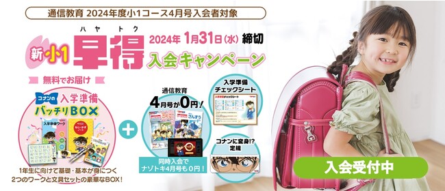 株式会社 小学館集英社プロダクションが運営する、小学館の通信教育 名探偵コナンゼミは、来春の新小学1年生を対象に、2024年度通信教育小1コース4月号に入会した方へ『新小1早得入会キャンペーン』(※1)の特別教材として「コナンの入学準備バッチリBOX」をお届けします。
