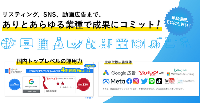 累計アカウント数2,120件、運用アカウント数495件の豊富なWeb広告運用実績と、GoogleやYahoo!に認められた確かな広告運用力があります。Googleが主催する「Premier Partner Awards」では、4期連続の国内ファイナリストに選出されており(※1)、Yahoo!のパートナー制度では、2つ星の代理店として認定を受けると同時に、国内で35社のみの広告運用認定パートナーとしても認定を受けています(※2)。