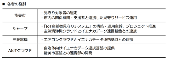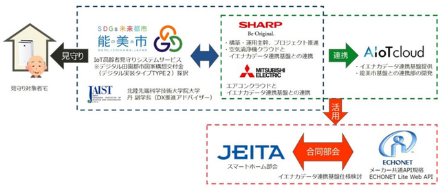 石川県能美市(市長:井出敏朗、以下 能美市)は、シャープ株式会社(本社:大阪府堺市、代表取締役社長 兼 CEO:呉柏勲、以下 シャープ)、三菱電機株式会社(本社:東京都千代田区、代表執行役 執行役社長:漆間啓、以下 三菱電機)および株式会社AIoTクラウド(本社:東京都江東区、代表取締役社長:松本融、以下 AIoTクラウド)の3者による協力の下、能美市在住の見守りを必要とする高齢者らがIoT家電を日常的に利用することにより、市内の関係機関・支援者が対象者を遠隔で見守ることができる「IoT高齢者見守りシステムサービス」の構築事業を2023年10月より着手し、2024年にサービス開始を目指します。