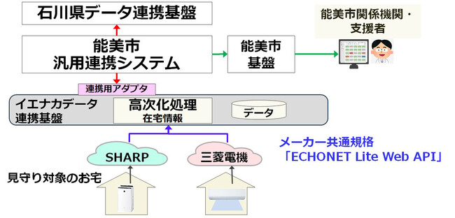 能美市は東西の広範囲にわたり市民が居住する地域環境のため、高齢者や要介護者の孤立リスクへの対策が課題となっています。今回、能美市が採択された「デジタル田園都市国家構想交付金(デジタル実装タイプTYPE2)(※2)」の計画に基づき、一般社団法人電子情報技術産業協会(JEITA)とエコーネットコンソーシアム(※3)が手掛けるプラットフォーム「イエナカデータ連携基盤」およびエコーネットコンソーシアムが推進するメーカー共通API規格「ECHONET Lite Web API」を活用することで、複数メーカーのIoT家電を対象とした高齢者見守りシステムを国内で初めて構築します。