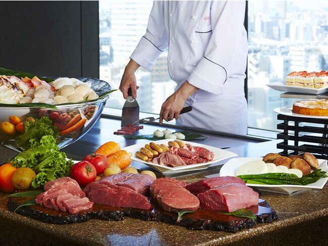 また、ランチタイムにはクリスマスバージョンの鉄板焼ステーキ食べ放題をご提供。焼き寿司、スープ、サラダ、オマール海老と帆立貝のソテーの後には、お好みの焼き加減でステーキを心ゆくまで堪能いただけます。サーロイン・ハラミなどに加え、クリスマス限定でヒレやカルビなど全7種類のお肉をご用意いたしました。熟練シェフの妙技で仕上げる鉄板焼でラグジュアリーなクリスマスをお楽しみください。