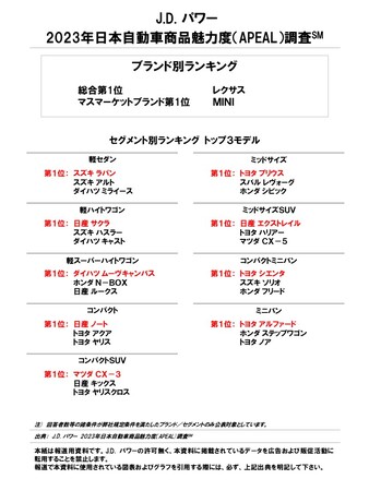 CS(顧客満足度)に関する調査・コンサルティングの国際的な専門機関である株式会社J.D. パワー ジャパン(本社:東京都港区、代表取締役社長:山本浩二、略称:J.D. パワー)は、J.D. パワー 2023年日本自動車商品魅力度(Automotive Performance, Execution and Layout、略称APEAL)調査(SM)の結果を発表した。