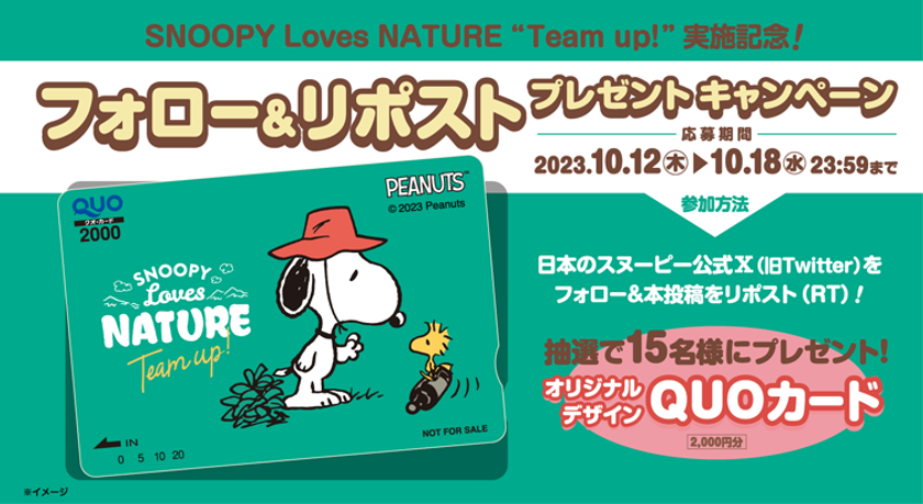 投稿いただいた方の中から、抽選で15名様に、『SNOOPY Loves NATURE“ Team up!”』オリジナルクオカード(非売品)2,000円分をプレゼントします。
