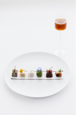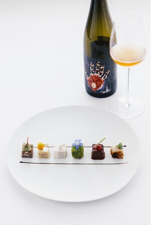 ワインは特にフランス産と信州産に力を入れています。コースを通して楽しめるよう、白、ロゼ、泡など提供のリズムも工夫しています。また、ソムリエがレシピを作るモクテル(ノンアルコールカクテル)も充実。料理とモクテルとで素材の香りを同調させたり、料理の旨味を引き出させたり、その一皿のためだけの一杯を生み出しています。