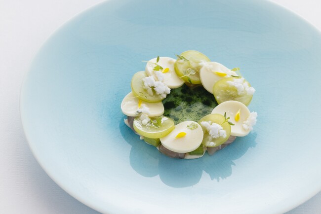 信州・軽井沢らしいメニューでおもてなしをしたい。その思いから、ユカワタンでは信州で古くから食されている鯉を年間通して提供しています。「鯉のコントラスト」は、2週間熟成させた鯉と血抜きをした鯉、2つの仕立てを味わえます。シャインマスカット、エルダーフラワーのクリーム、セロリのグレック(マリネ)とともに、鯉のコンソメとハーブオイルを合わせたソースで味わう一皿です。