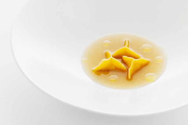 日本では10~11月に狩猟が解禁されるので、秋にはジビエを口にする機会も増えてきます。この秋ユカワタンでは、ジビエの一種である猪を旬の茸とともにラビオリにし、スープ仕立てで提供します。スープは猪のほかに鹿などのジビエをコンソメにした深みのある味わい。ラビオリにした旨味の濃い猪と香り高い茸によく合います。