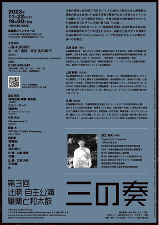 宇崎竜童、十三代目市川團十郎、上妻宏光、大石将紀等と共演を重ね、様々なジャンルのトッププレイヤー達からソロの和太鼓奏者として信頼の厚い辻が、地元である武蔵野市で2017年から3年に1度、2人の共演者をよび開催しているシリーズが「三の奏」です。