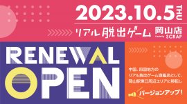 株式会社SCRAP(所在地:東京都渋谷区、代表者:加藤隆生)は、本日2023年10月5日(木)より「リアル脱出ゲーム岡山店」を移転しリニューアルオープンいたします。
