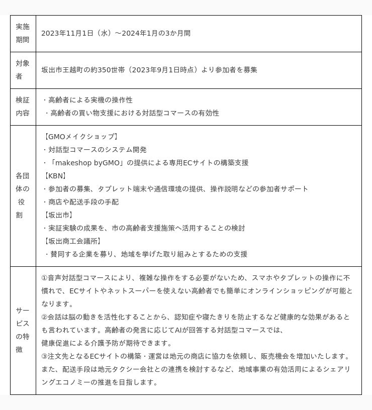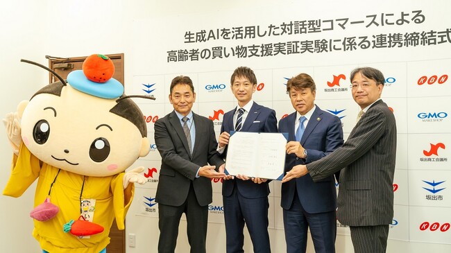 GMOインターネットグループのGMOメイクショップ株式会社(代表取締役社長CEO:向畑 憲良、以下、GMOメイクショップ)は、2023年11月1日(水)より、香川県坂出市でケーブルテレビや通信事業を展開するKBN株式会社(代表取締役:北村昌士、以下、KBN)、坂出市(市長:有福 哲二)、坂出商工会議所(会頭:三谷 朋幹)と連携し、「生成AIによる対話型コマース」を利用した高齢者の買い物支援策の提供に向け、高齢化率の高い坂出市王越町で、実証実験を開始いたします。