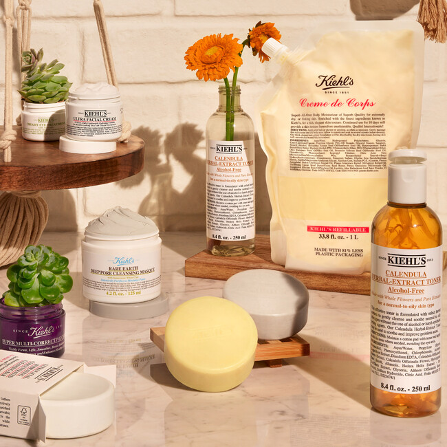 キールズで発売している製品は再利用や詰替が可能なものばかり。例えば、アイコン製品であるキールズ クリーム UFCは30%リサイクル済素材、カレンデュラ*2 トナーは100%リサイクル素材で作られたパッケージを使用。クリームUFCやボディ、ヘアケア製品は詰め替え用リフィル製品も発売をしています。お得で、地球にもやさしい選択をしていただけます。
