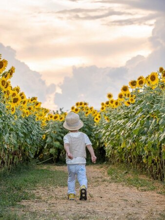 夕暮れのひまわり畑と一緒に子どもの今しかない姿を残せたらと思い、日の入り時刻を調べた上で撮影に臨みました。望遠レンズを使用し、ひまわりの高さが伝わるように意識して撮りました。