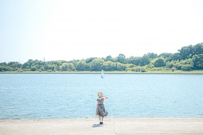 自分が被写体となったり小道具と一緒に撮影することで、太陽の光が反射してキラキ ラと光る彩湖の美しさを表現しました。彩湖の豊かな自然を表現できるよう、広めの画角で空と森、湖のバランスに意識して撮影しました。