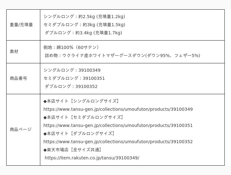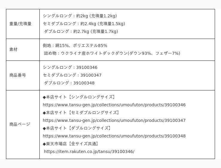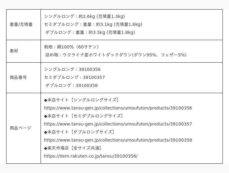 羽毛布団「平和の羽毛」4種はタンスのゲン本店とタンスのゲン楽天市場店にて取り扱っております。それぞれシングルロング/セミダブルロング/ダブルロングのサイズ展開で販売をしております。