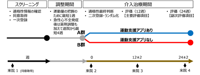 くじを引くような方法でいずれかに割り当てられ、その確率は2分の1です。患者には、運動検査の結果から得られた実践すべき運動の量と強さを医師より説明し、その説明内容に沿った運動を日常生活の中で実践してもらいます。その際、通常の診療と同様に、運動に関するパンフレットをお渡しし、運動を実践してもらいます。加えて、A群に割り振られた患者には、治験機器である「運動支援アプリ」を使用します。3か月後の運動能力の改善度合いを主要評価項目としています。