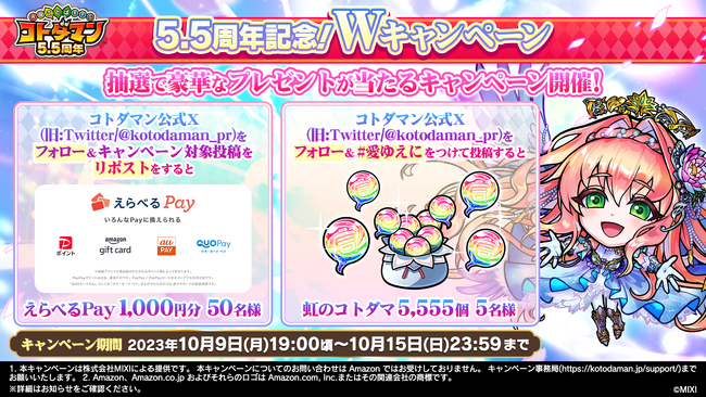 また、コトダマン公式X(旧Twitter)アカウントをフォローし、コトダマン公式アカウントから投稿されるPVのキャンペーン対象ポストをリポストすると、抽選で50名様に「えらべるPay」1,000円分、「#愛ゆえに」を付けてポストすると抽選で5名様に「虹のコトダマ」5,555個が当たる「Wキャンペーン」を実施します。