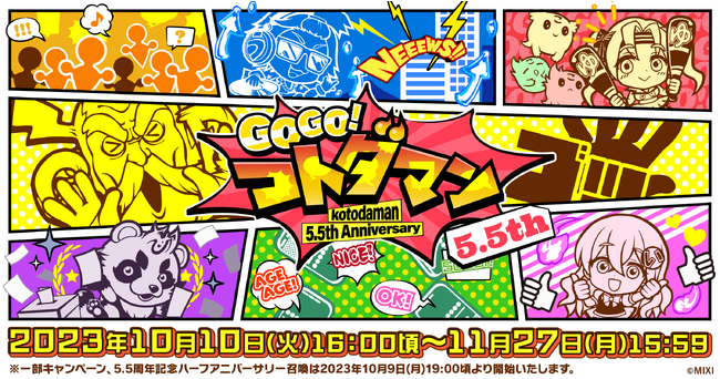 株式会社MIXI(東京都渋谷区、代表取締役社長CEO:木村 弘毅)は、スマホアプリの「ことば」で闘う新感覚RPG「共闘ことばRPG コトダマン」(以下コトダマン)において、10月16日(月)でサービス開始から5.5周年を迎えます。これを記念して、10月10日(火)より5.5周年記念イベントを開催します。