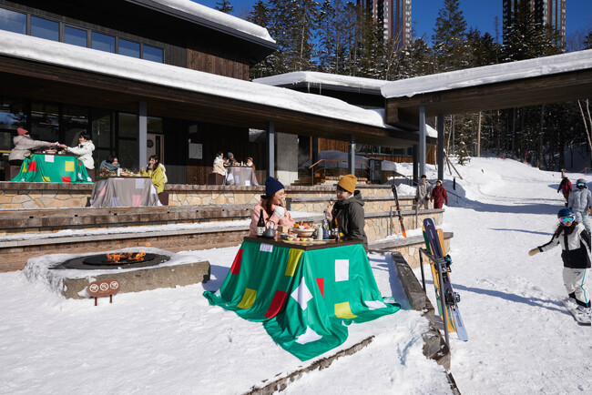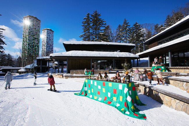 北海道の大地を感じるネイチャーワンダーリゾート「星野リゾート トマム」の「ホタルストリート」に、2023年12月1日、「スキーインスキーアウトこたつラウンジ」が今冬も登場します。ホタルストリートは、食事や買い物が楽しめる9店舗が軒を連ねたスキーインスキーアウトヴィレッジです。雪景色を前に、リゾートのランドマークであるトマム ザ・タワー柄のこたつで暖まりながら、海鮮や山菜を使用した北海道ならではの昆布出汁おでんと出汁割り日本酒が味わえます。