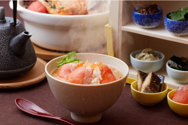 昨年好評だったスペシャルおでん鍋を最後の出汁まで味わい尽くせるよう、今冬はスペシャルおでん鍋の締めセットが登場。土鍋で炊いたご飯に、魚介の旨味たっぷりの出汁と、付け合わせの北海道らしい食材をのせて、お茶漬けとして楽しめます。付け合わせはゴンドラをモチーフにしたコンディメントBOXに乗せて提供。「漬けサーモン」「鰊の甘露煮」「おぼろ昆布」「海苔」「松前漬け」「三つ葉」の6種類が並びます。スペシャルおでん鍋の付け合わせと併せて合計10種類を、お茶漬けにトッピングでき、味の変化を楽しめます。