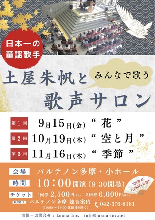 Luana合同会社主催、『土屋朱帆とみんなで歌う『歌声サロン』第2回“空と月”』が2023年10月19日 (木)にパルテノン多摩 小ホール(東京都多摩市落合2-35)にて上演されます。