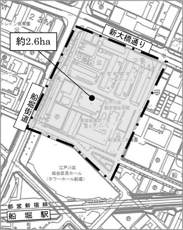 本事業は、都営新宿線「船堀」駅に近接し、江戸川区の複合文化施設であるタワーホール船堀の北側に面する船堀四丁目の一部で、区域面積は約2.6ha。区域を南北2つの敷地に分け、新大橋通りに面する北側敷地には現在地から移転する江戸川区庁舎を新設し、南側敷地には再開発ビルを建設する計画となっております。