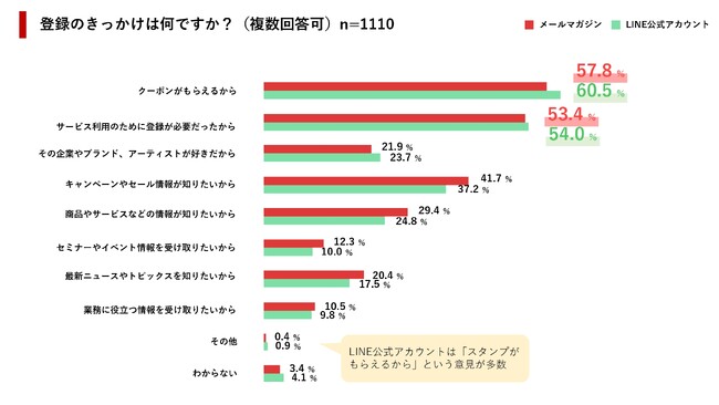 登録のきっかけとして、「クーポンがもらえるから」という理由がともに1位となっていますが、メールマガジン=57.8%、LINE=60.5%とLINEのほうがより顕著にクーポン利用を目的としていることがわかります。