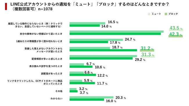 メールマガジンで配信停止の原因として高い割合を持つ「配信頻度」については、LINEではやや低い数値となっており、ブロックよりもミュートの原因となることがわかります。
