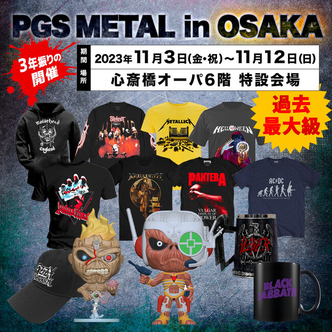 日本最大の音楽・映画・ドラマ他公式グッズストアPGSを運営する株式会社JAMSHOPPINGは、ライヴハウス「Yogibo META VALLEY / Yogibo HOLY MOUNTAIN」が大阪なんばに10月28日(土)オープンを記念して人気ヘヴィメタルのアーティストMETALLICA、IRON MAIDEN、JUDAS PRIEST、OZZY OSBOURNE、SLIPKNOT等の世界中から集めたアパレルや雑貨といった新商品や人気商品、限定商品等、公式ライセンス商品の数々を販売するヘヴィメタルの祭典『PGS METAL in OSAKA』を、大阪・心斎橋オーパ6F 特設会場にて2023年11月3日(金・祝)~11月12日(日)の日程で過去最大規模で開催いたします。
