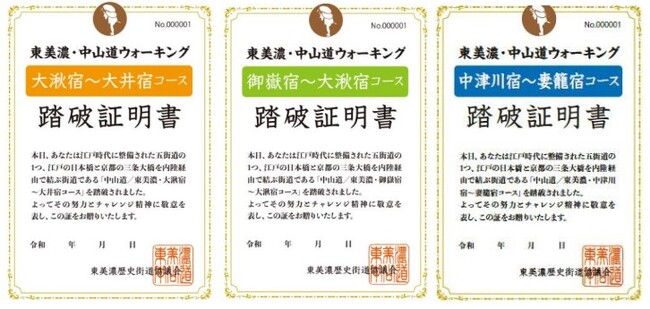 ウォーキング対象区間は、広見線御嵩駅近くの岐阜県御嶽宿から長野県妻籠宿までの全長46.8kmをバリエーションに富んだ3コースに分けて設定します。ゴールに到達すると、それぞれのコースでオリジナルの踏破証明書をプレゼントします。