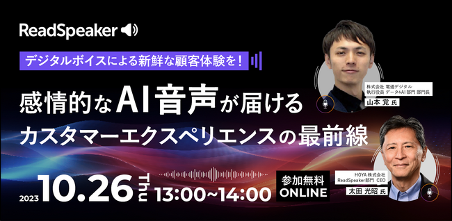 HOYA株式会社(本社:東京都新宿区、代表執行役CEO 池田英一郎)MD部門ReadSpeaker SBU/リードスピーカー・ジャパン株式会社は、2023年10月26日(木)に【感情的な「AI音声」が届けるカスタマーエクスペリエンス最前線】無料ウェビナーを開催する事をお知らせいたします。