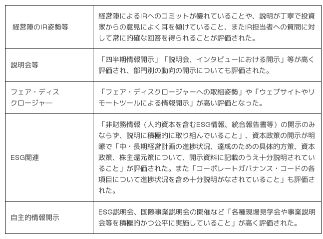 「証券アナリストによるディスクロージャー優良企業選定」は、1995年から毎年実施されている表彰制度で、証券アナリストが企業のディスクロージャーの質、量、タイミング等の優劣を判断するための客観的な評価基準を策定し、それをもとに選定されるものです。