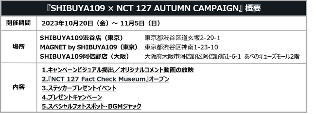 株式会社SHIBUYA109エンタテイメント(本社:東京都渋谷区、社長:石川あゆみ)は、東京・渋谷で運営する「SHIBUYA109渋谷店」「MAGNET by SHIBUYA109」、及び「SHIBUYA109阿倍野店」(大阪府大阪市)の3施設にて、2023年10月20日(金)~11月5日(日)の期間、話題のグローバルボーイズグループ「NCT 127」(エヌシーティー 127)をキャンペーンモデルに起用した『SHIBUYA109 × NCT 127 AUTUMN CAMPAIGN』を開催いたします。